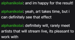 Very responsive, very very kind! Literally live streamed a lot of the process, which is unheard of and was such a nice thing to see, made the process so nice and smooth!! HIGHLY RECOMMEND! Will commision them again in the future💗